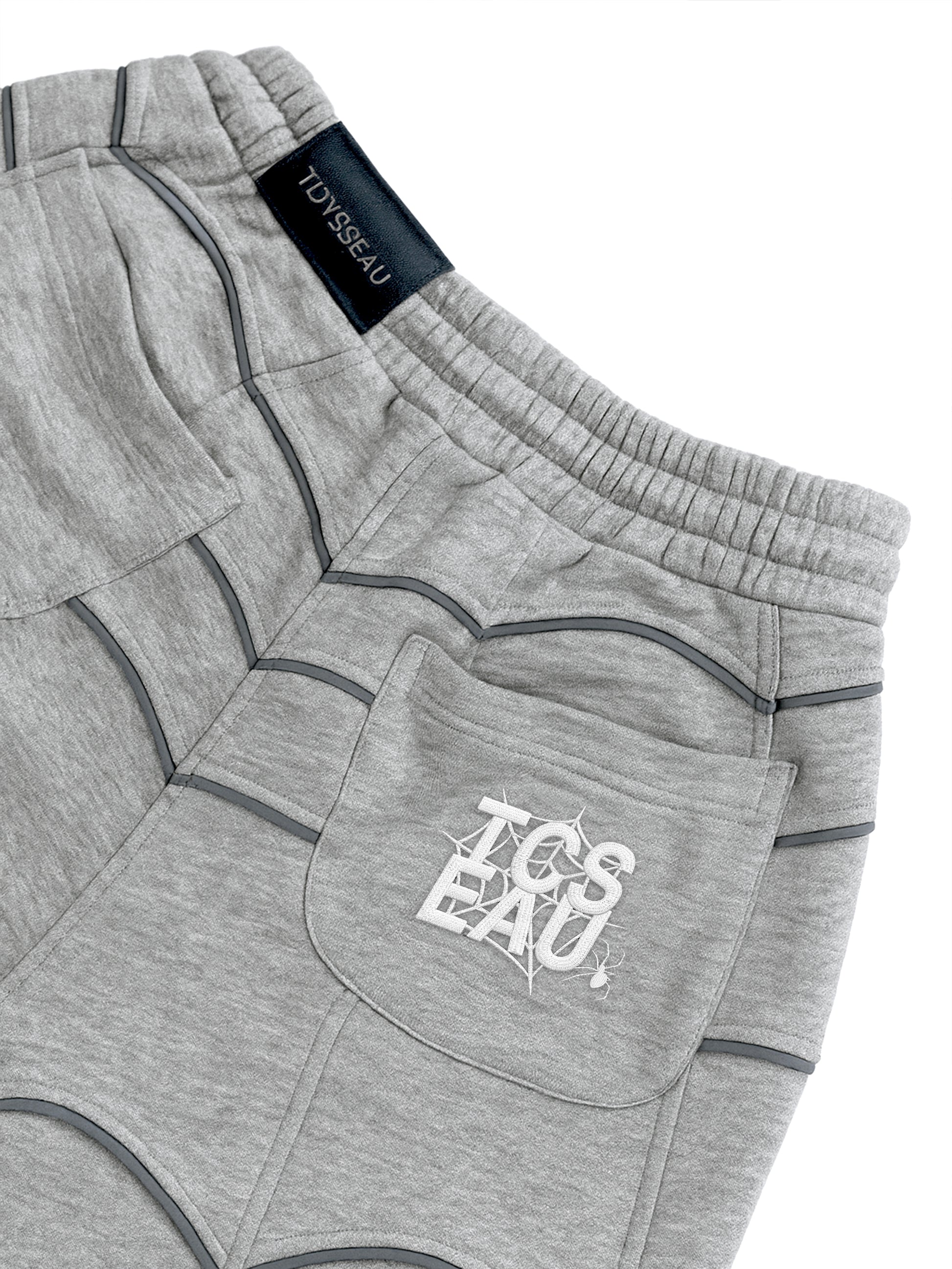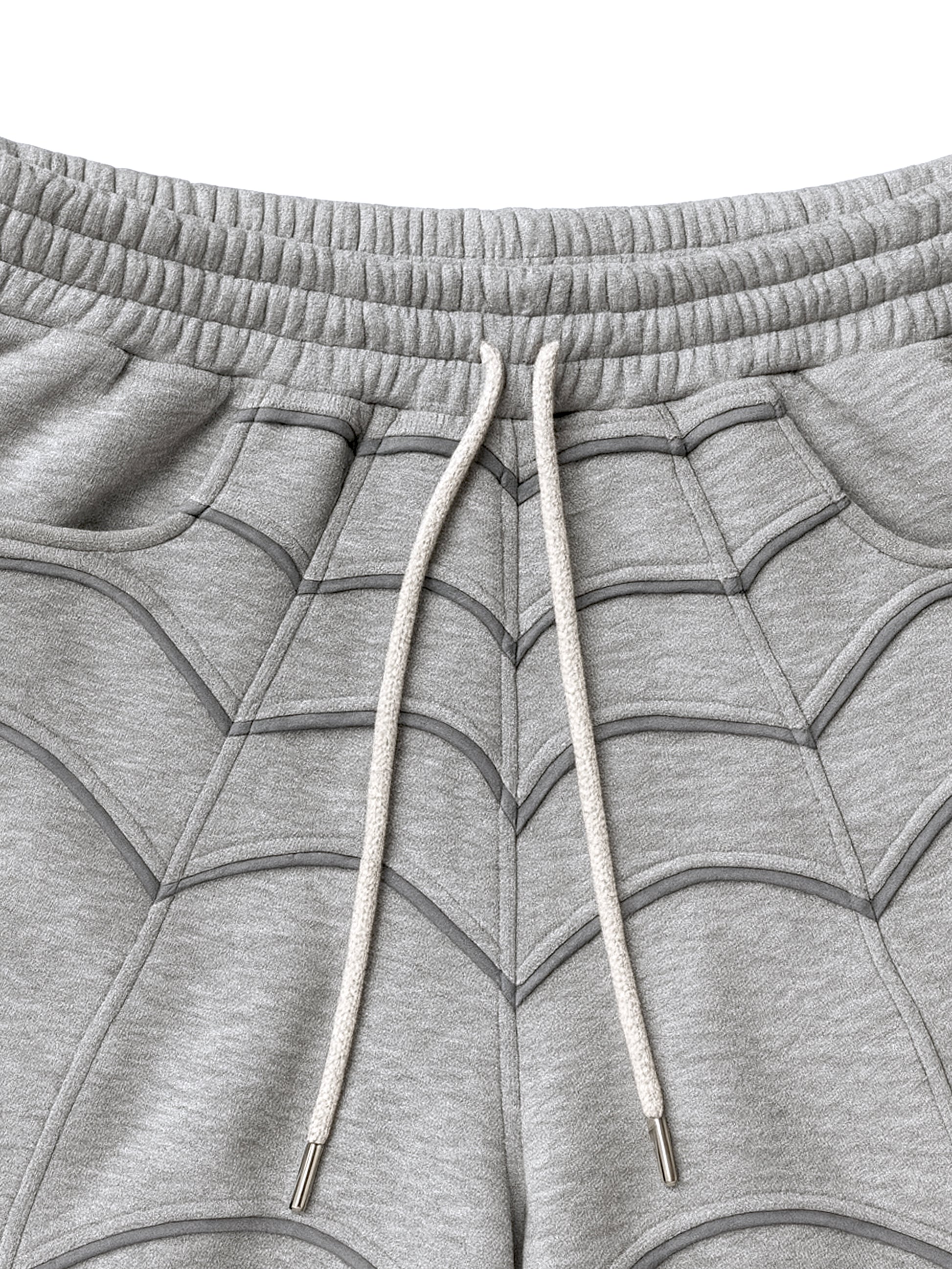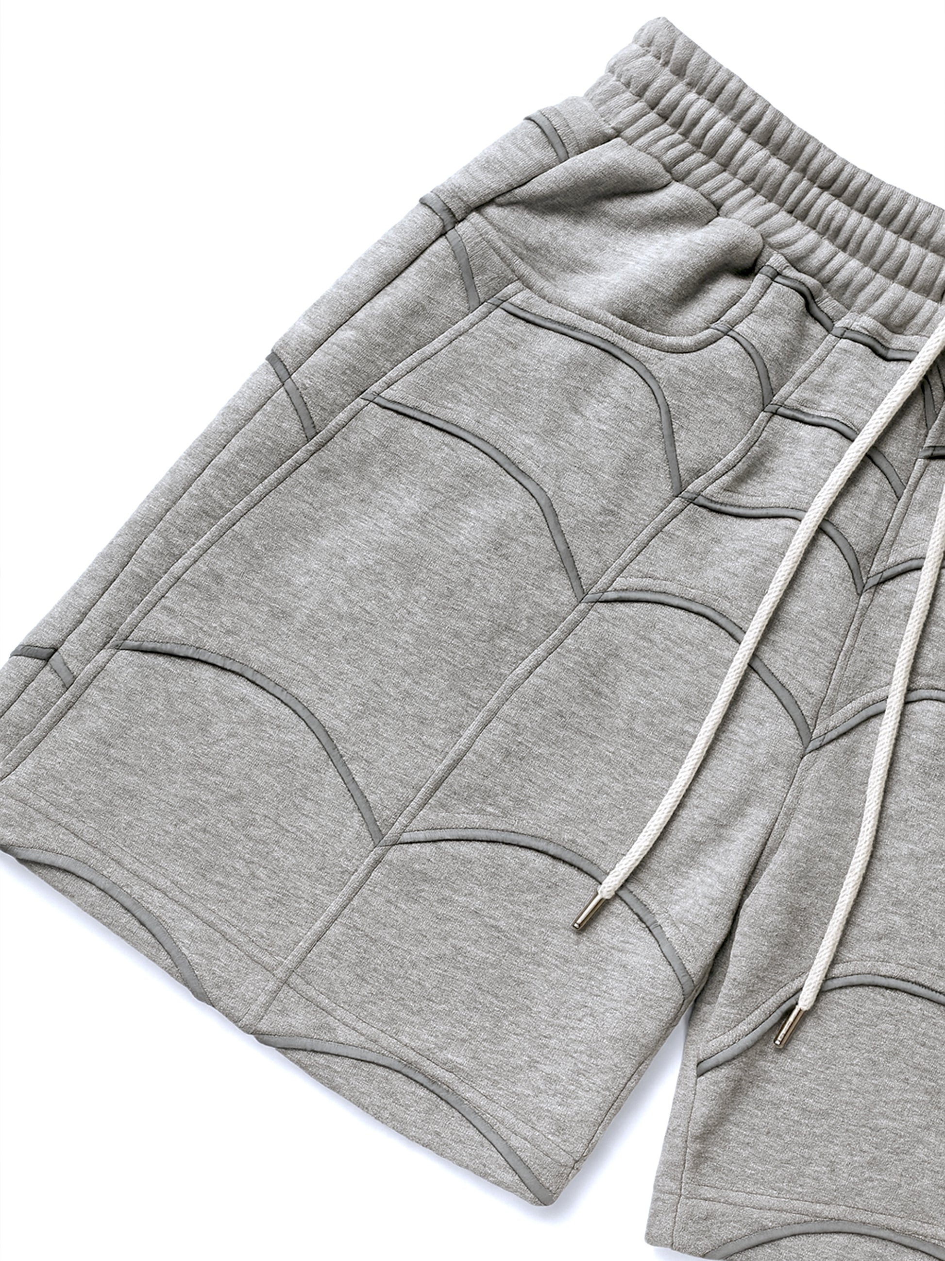 Constructed from 330 GSM heavyweight fabric, the shorts offer a substantial feel while remaining breathable and easy to wear. The defining feature is the 3mm reflective spider line detailing, laid out symmetrically across the front panels to add depth and subtle contrast as light hits the surface.